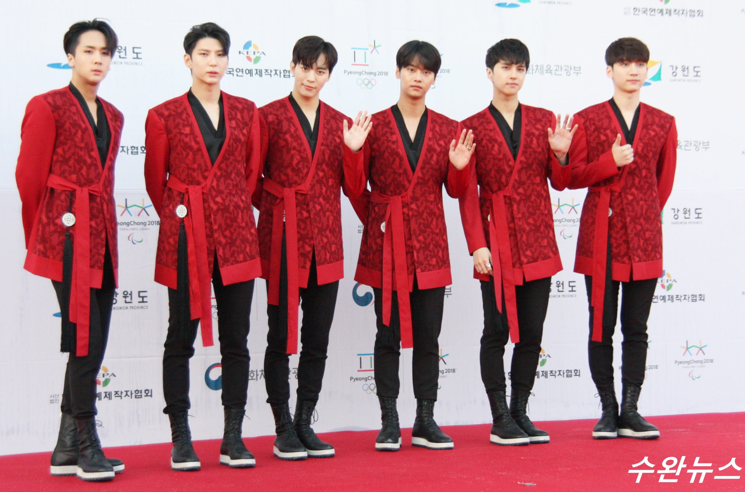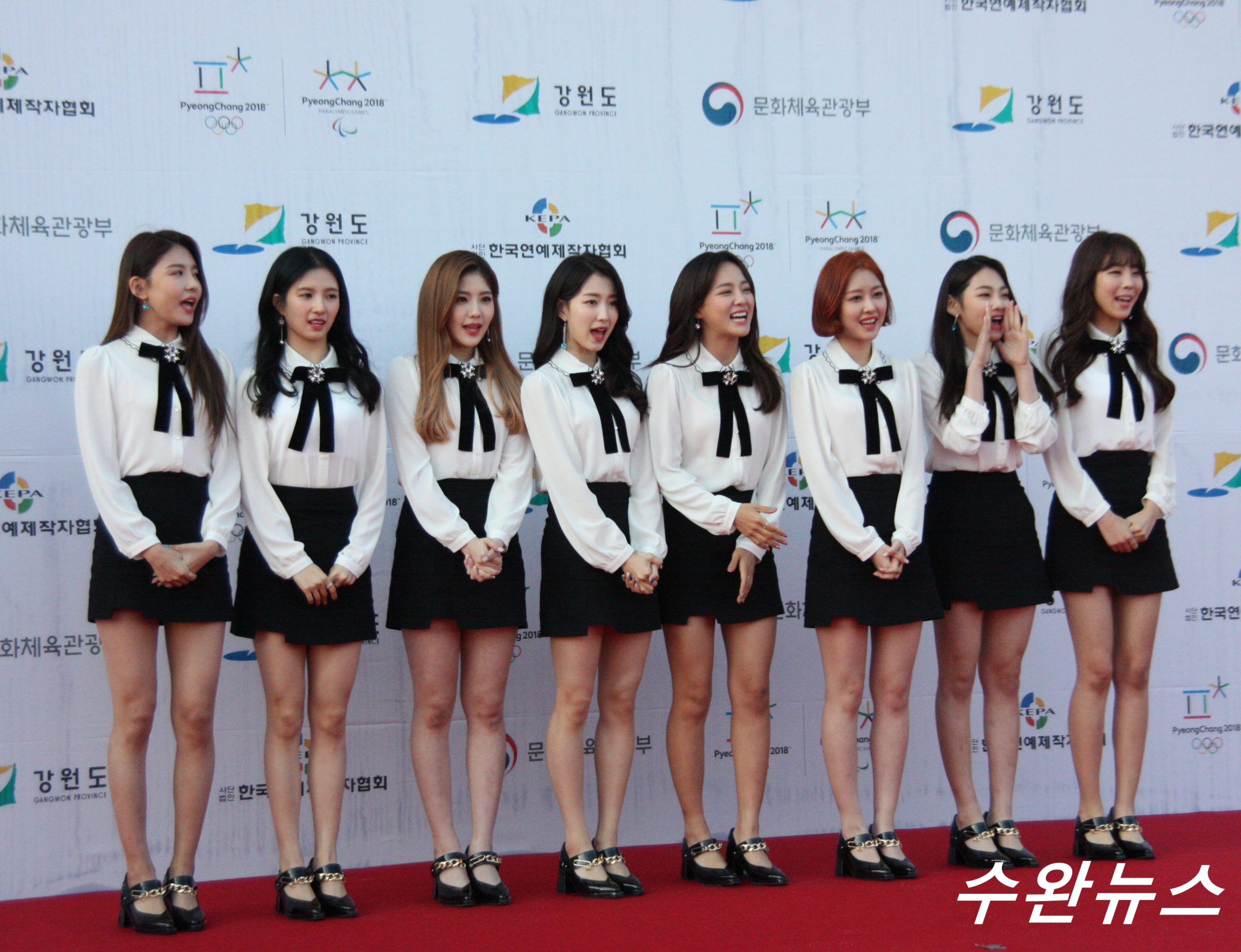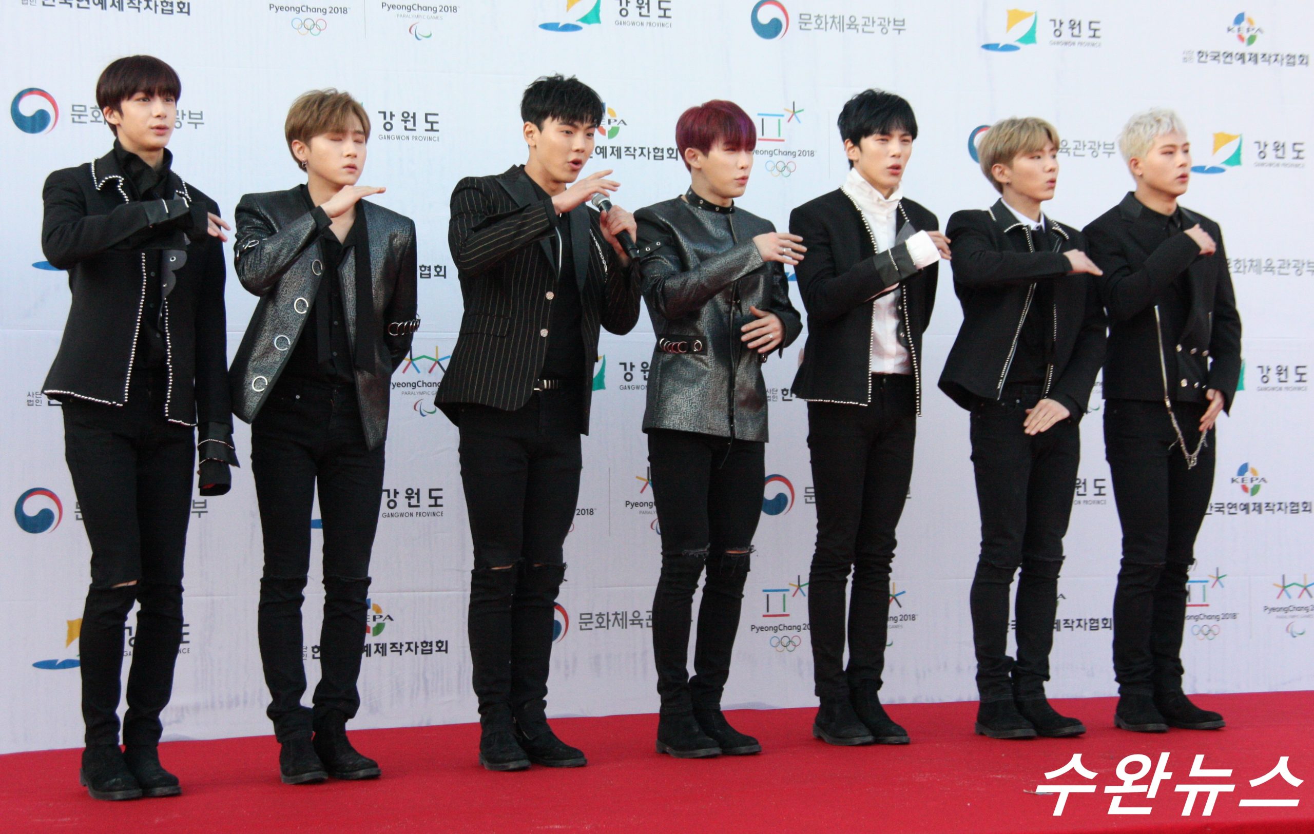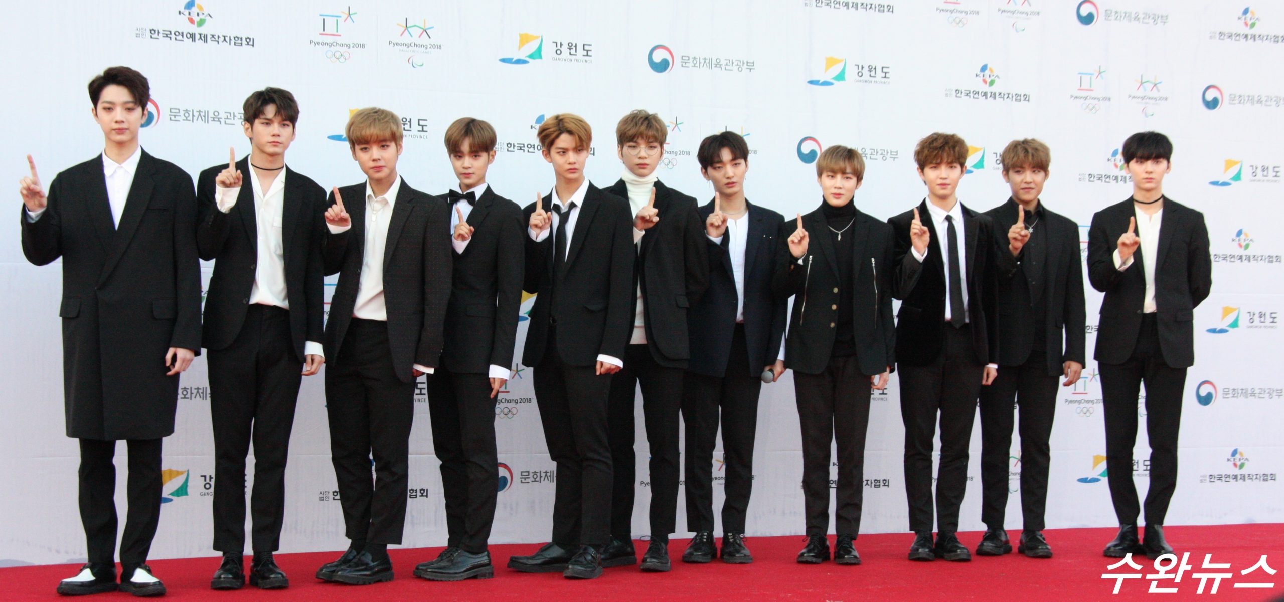 [수완뉴스=평창올림픽플라자] 오늘 (4일) 강원도 평창 올림픽플라자에서 경기장 오픈 기념으로 개최한 드림콘서트에 참석한 연예인들(몬스터엑스, 헤일로, 라붐, CLC, BIF, 다이아, 구구단, 프리스틴, 위키미키, 뉴이스트, 아스트로 등)이 레드카펫에 서서 포즈를 취하고 있다. / 사진: 김동주 선임기자