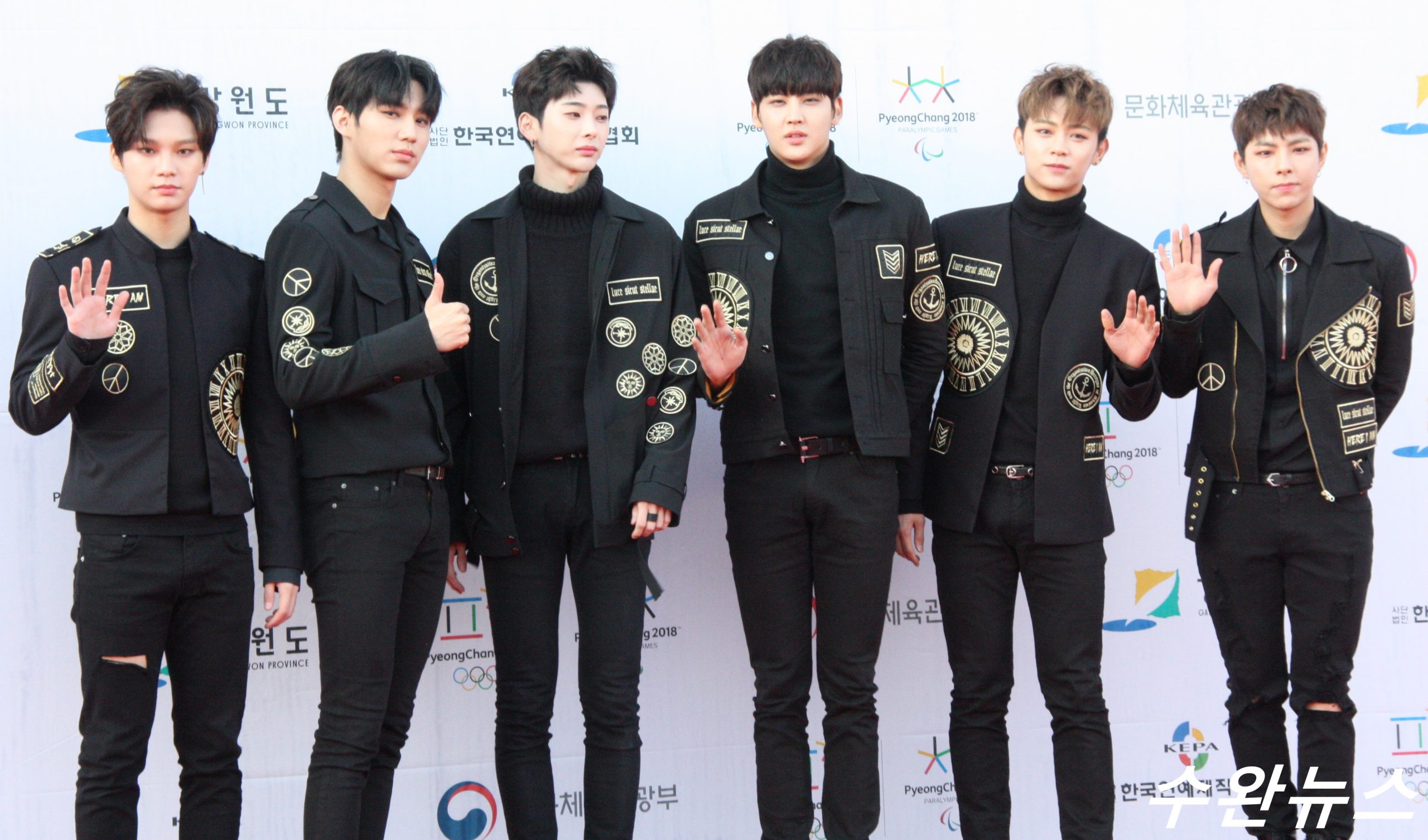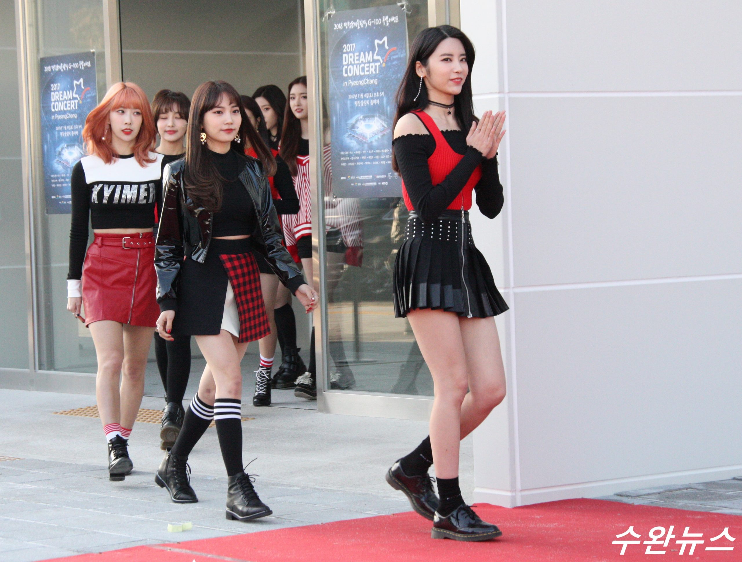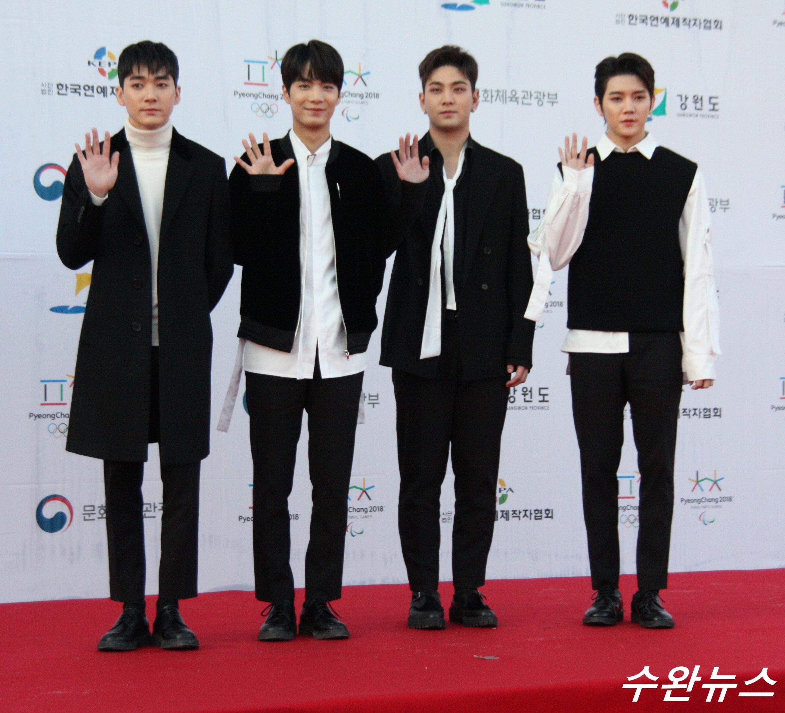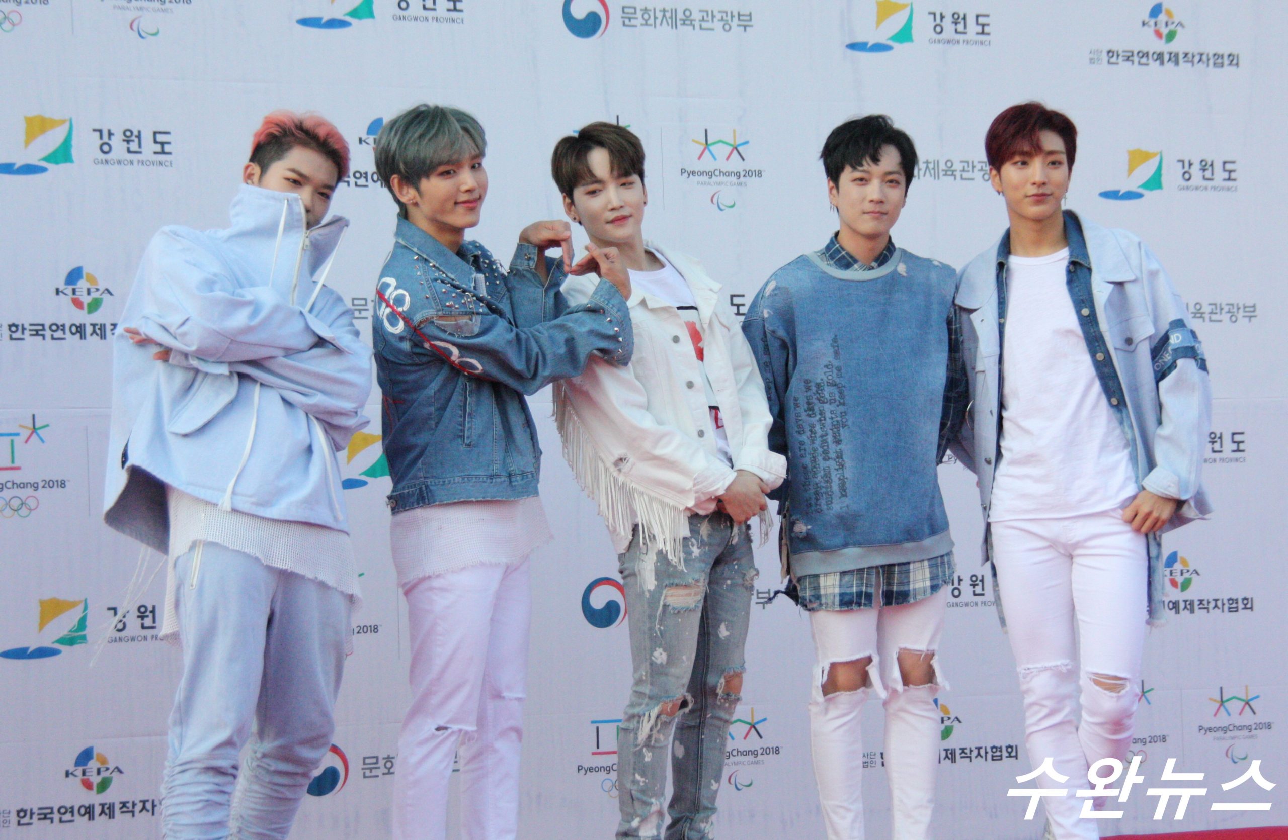 [수완뉴스=평창올림픽플라자] 오늘 (4일) 강원도 평창 올림픽플라자에서 경기장 오픈 기념으로 개최한 드림콘서트에 참석한 연예인들(몬스터엑스, 헤일로, 라붐, CLC, BIF, 다이아, 구구단, 프리스틴, 위키미키, 뉴이스트, 아스트로 등)이 레드카펫에 서서 포즈를 취하고 있다. / 사진: 김동주 선임기자