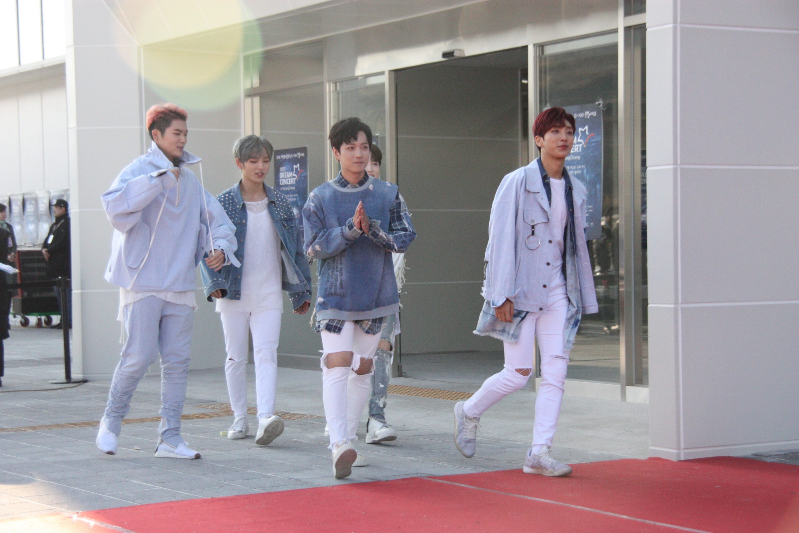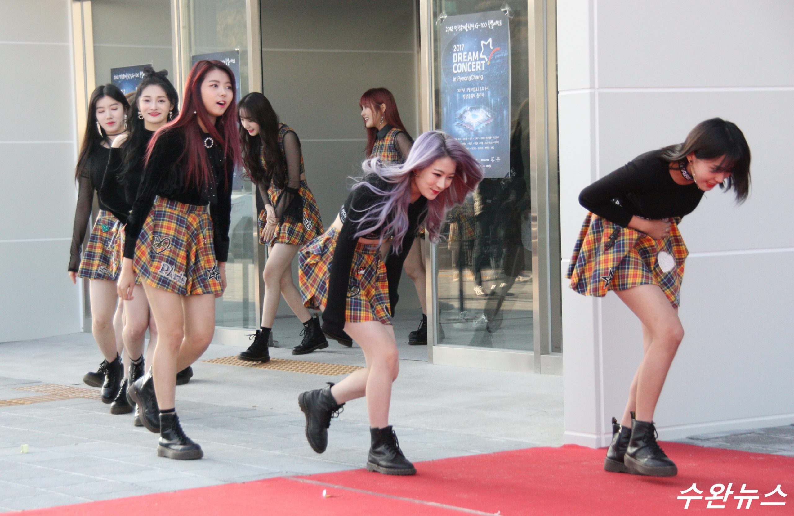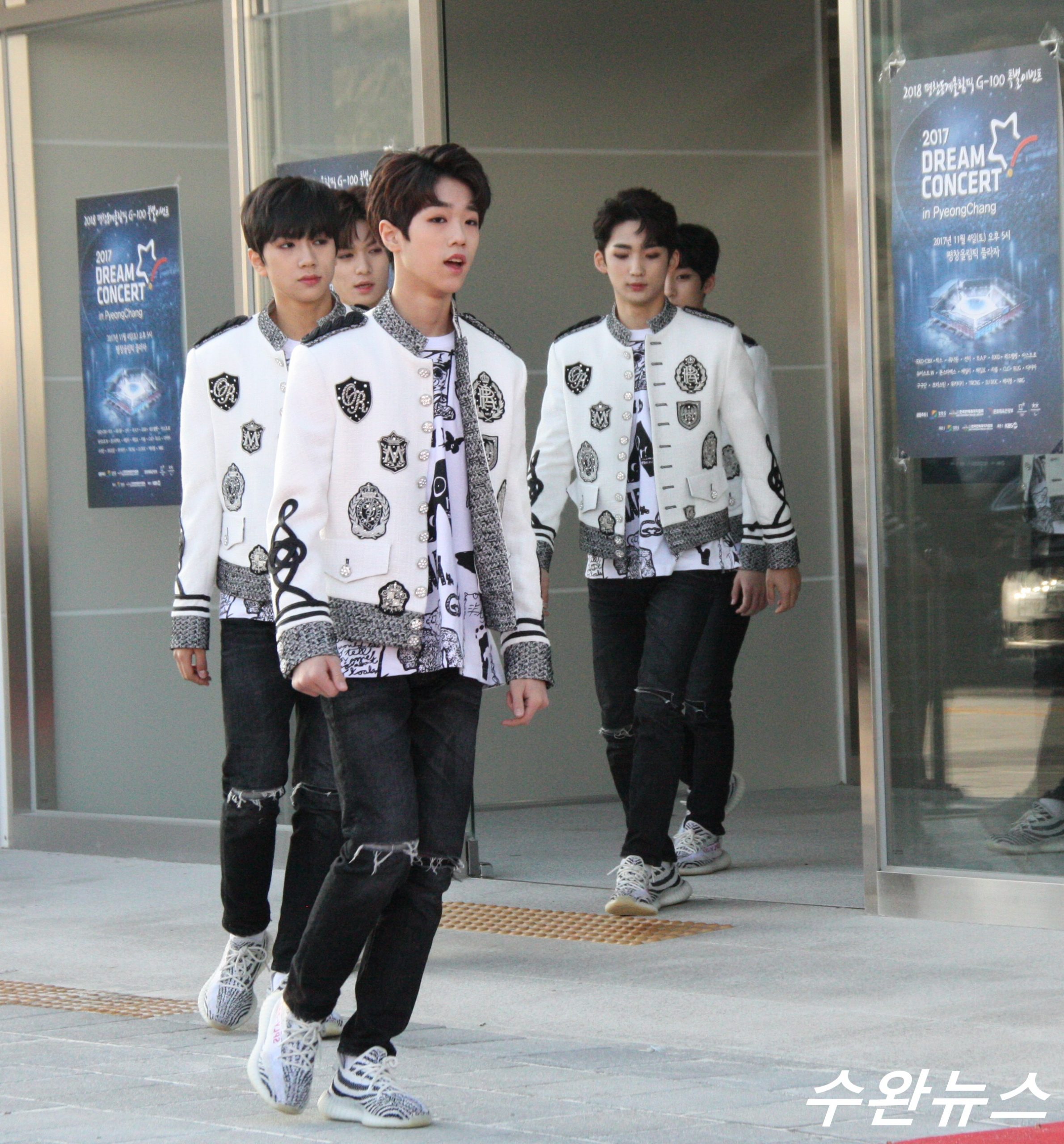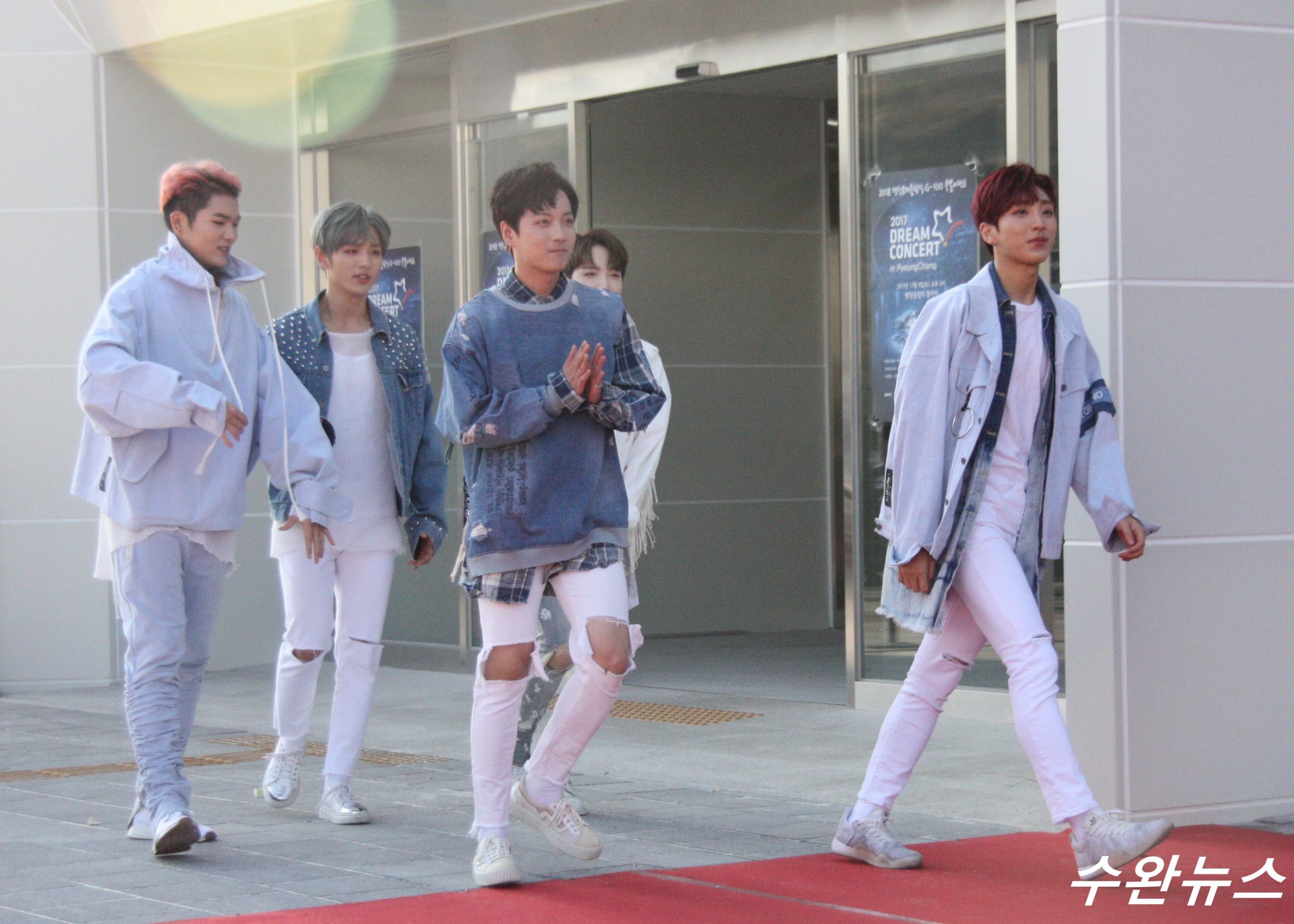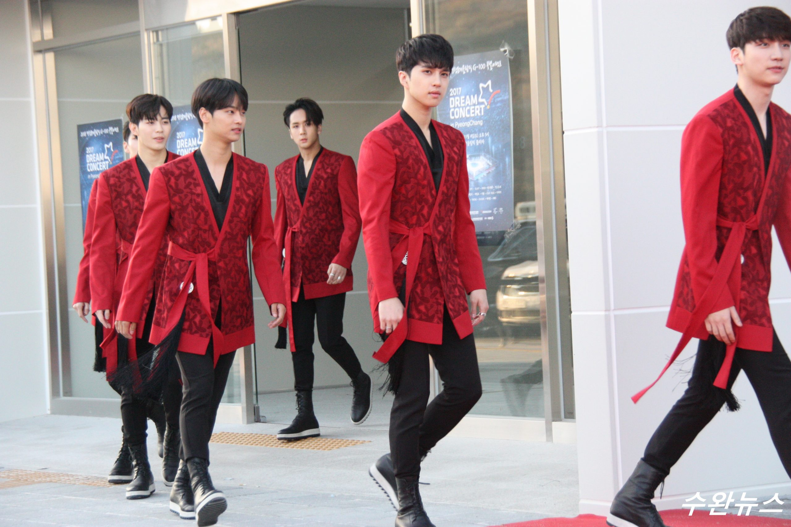[수완뉴스=평창올림픽플라자] 오늘 (4일) 강원도 평창 올림픽플라자에서 경기장 오픈 기념으로 개최한 드림콘서트에 참석한 연예인들(몬스터엑스, 헤일로, 라붐, CLC, BIF, 다이아, 구구단, 프리스틴, 위키미키, 뉴이스트, 아스트로 등)이 레드카펫에 서서 포즈를 취하고 있다. / 사진: 김동주 선임기자