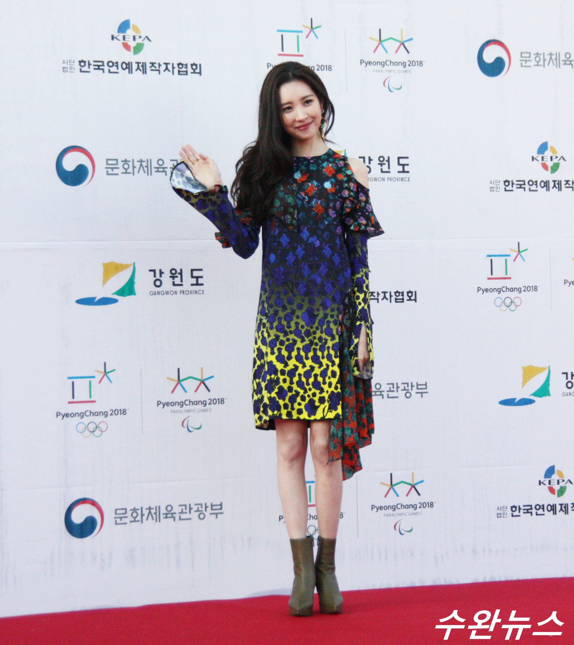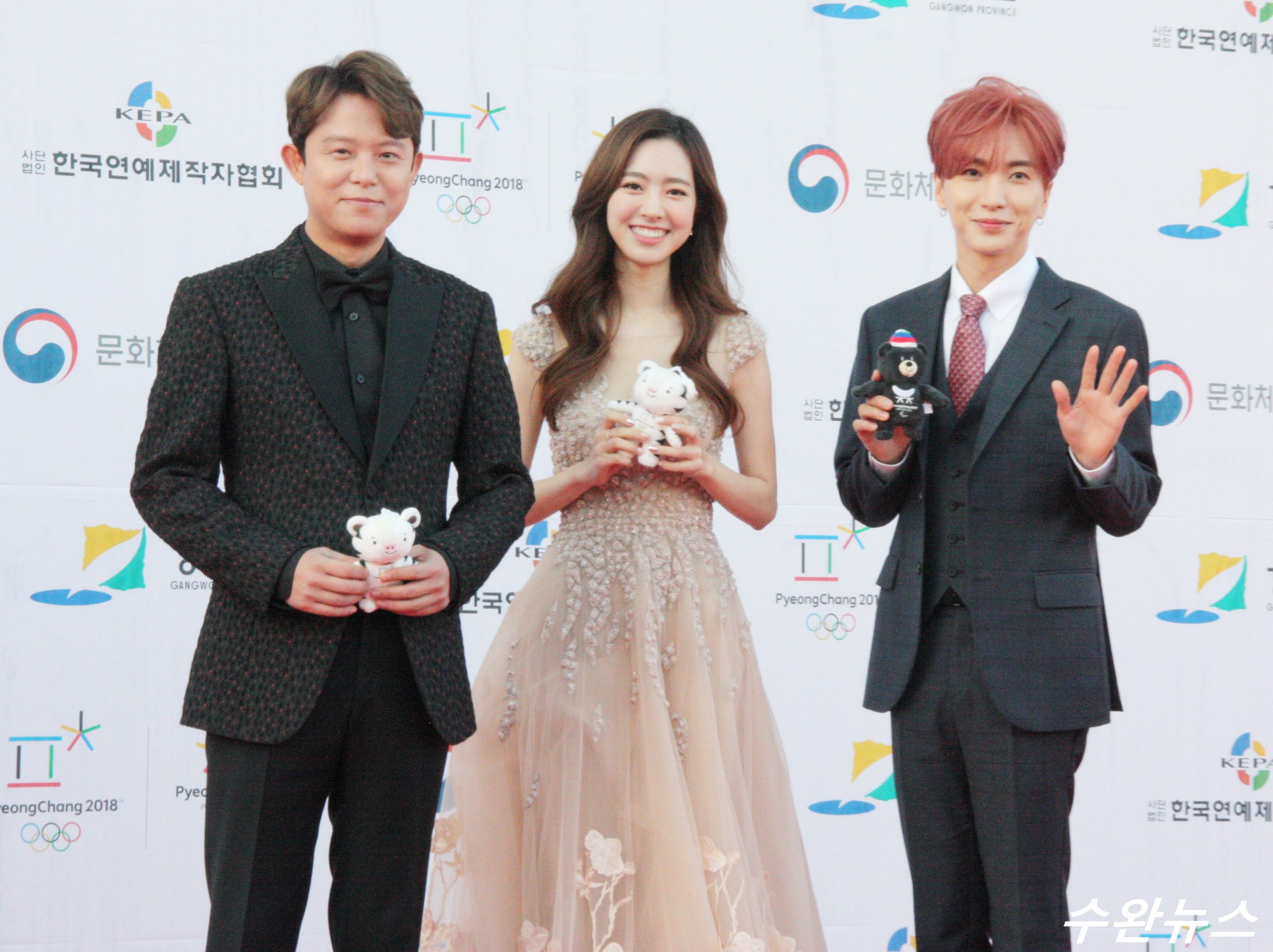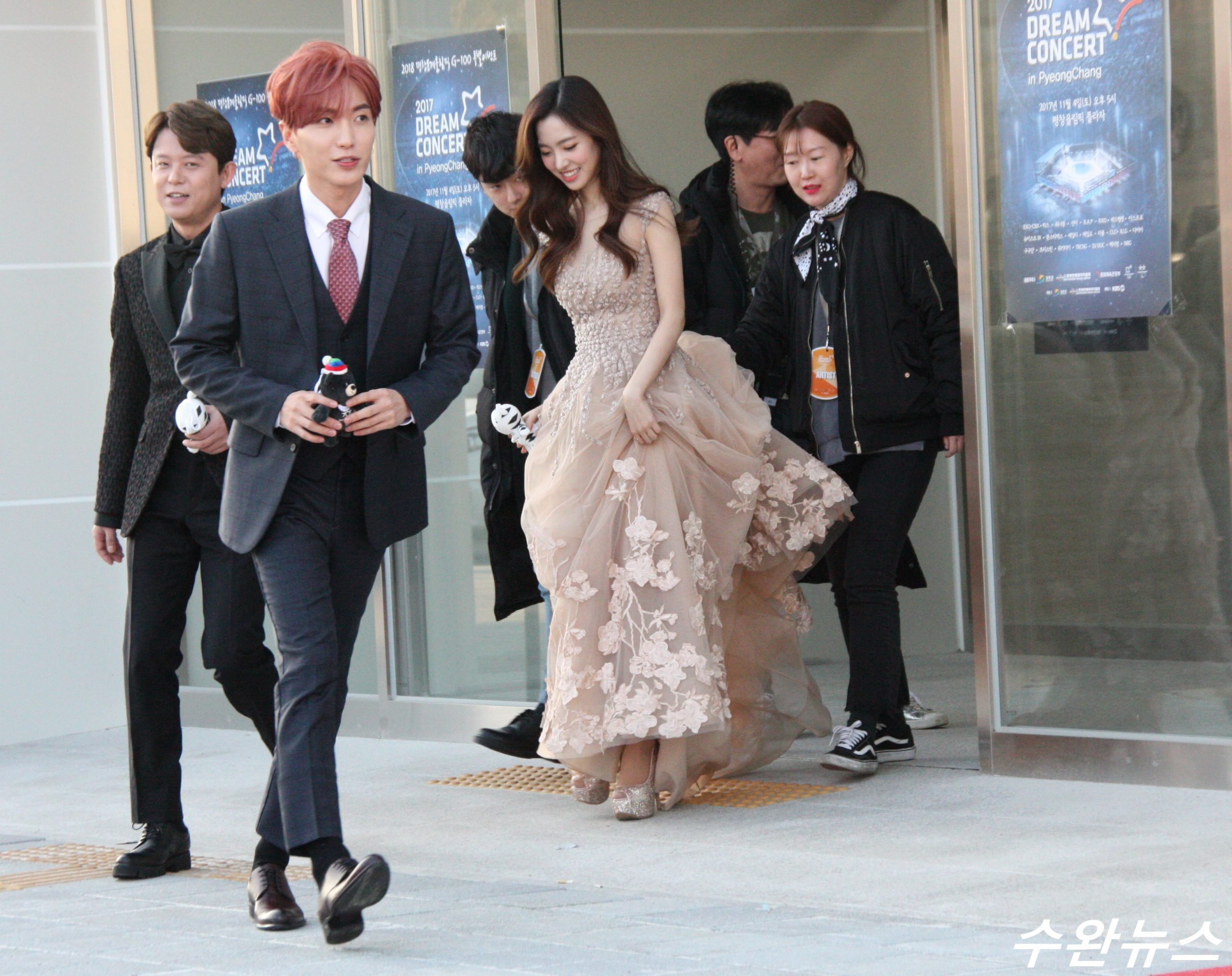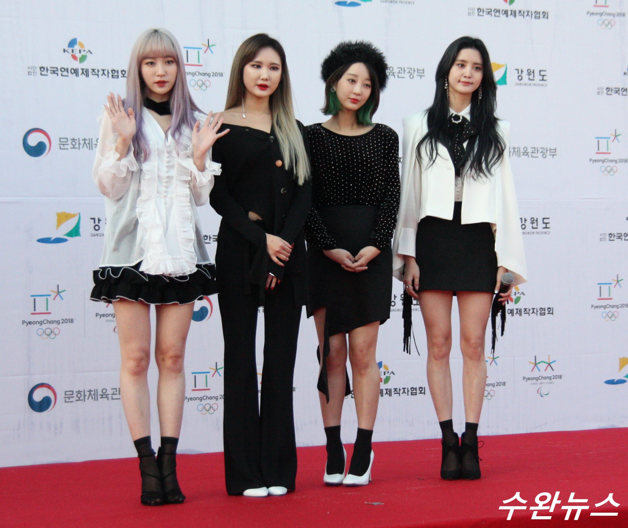 [수완뉴스=평창올림픽플라자] 오늘 (4일) 강원도 평창 올림픽플라자에서 경기장 오픈 기념으로 개최한 드림콘서트에 참석한 연예인들(몬스터엑스, 헤일로, 라붐, CLC, BIF, 다이아, 구구단, 프리스틴, 위키미키, 뉴이스트, 아스트로 등)이 레드카펫에 서서 포즈를 취하고 있다. / 사진: 김동주 선임기자