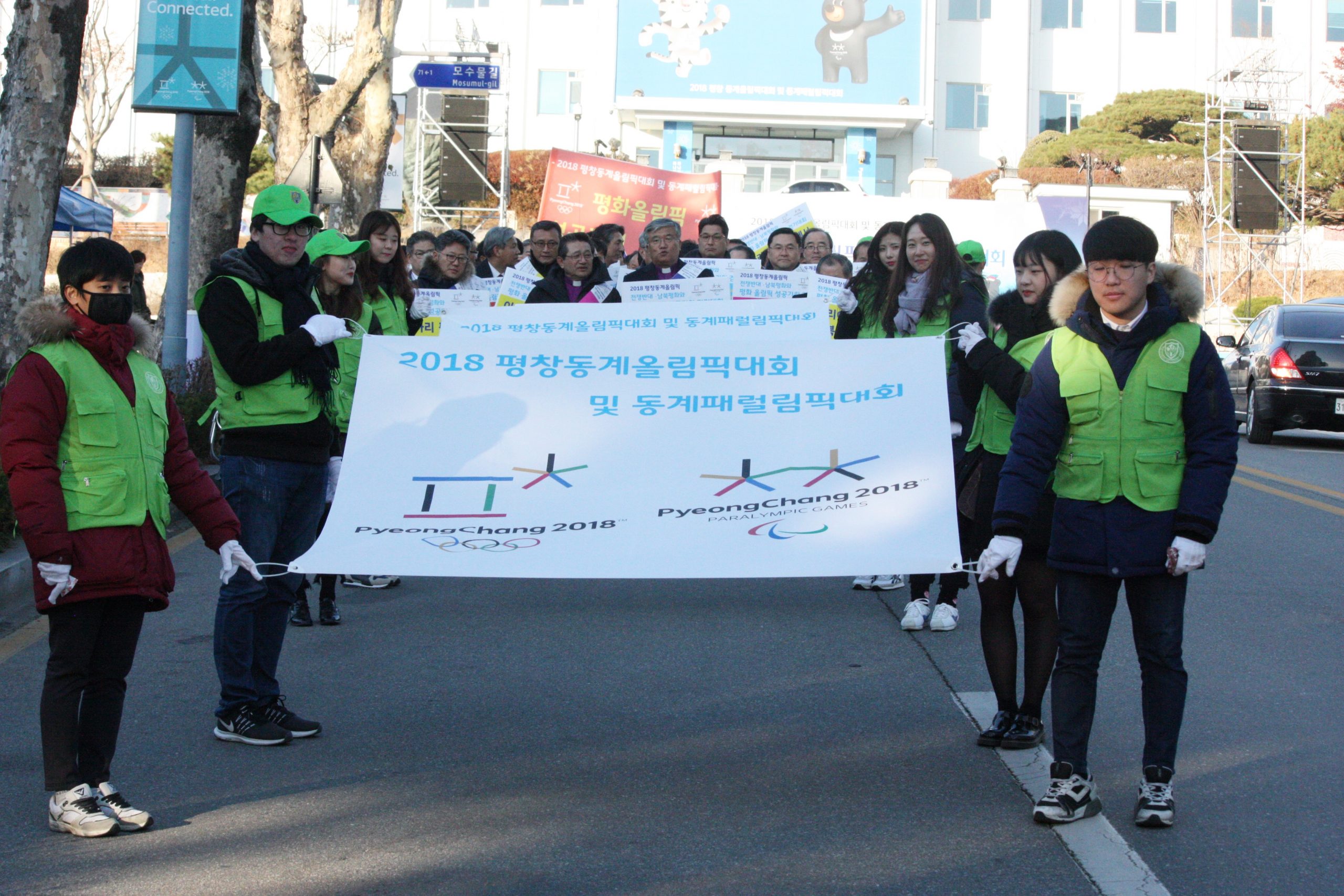 [수완뉴스=도청광장] 오늘 19일 강원도청 광장과 춘천평화생태공원까지 2018 평창 동계올림픽 대회의 평화올림픽으로의 성공개최를 기원하기 위한 걷기대회가 개최했다. 이날 강원도민과 종교인 2,018명과 주요인사 엄기호 한기총 회장, 김선규 한기연 회장, 전명구 기독교감리회 감독회장, 최헌영 기독교감리회 동부연회 감독의 참가한 아래 대회가 진행되었다. 걷기대회는 기독교대한감리회 동부연회의 주최 · 주관으로 열렸으며 평화올림픽 성공기원을 위한 선언문 낭독 등이 있었다.