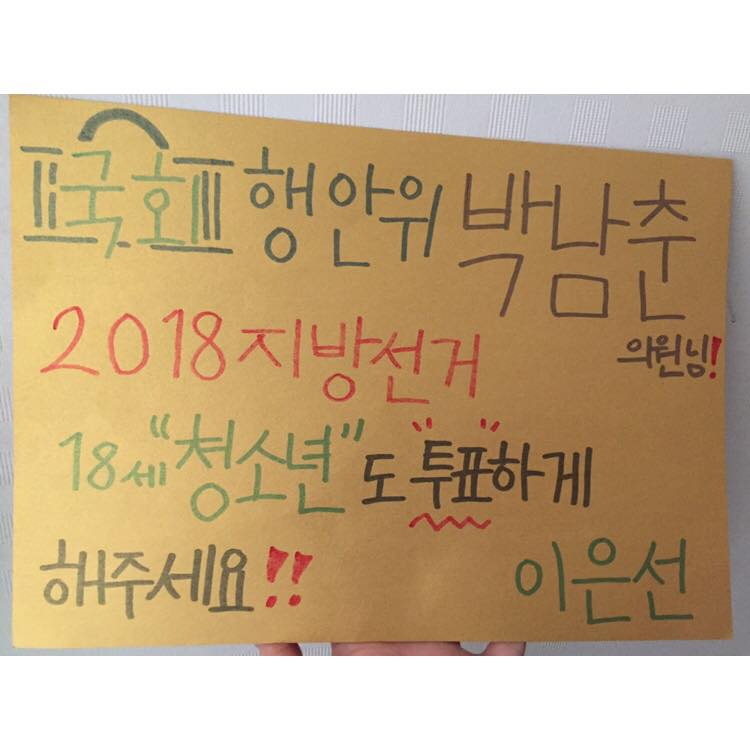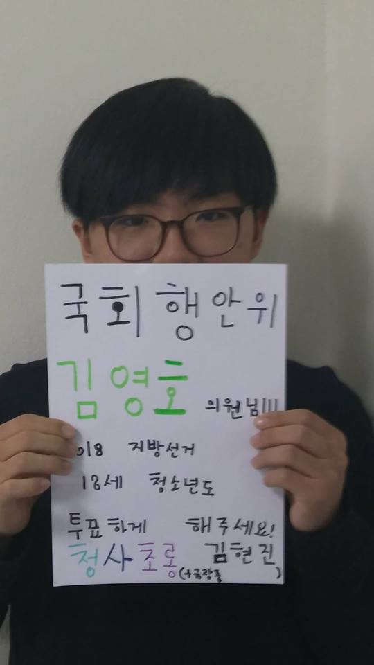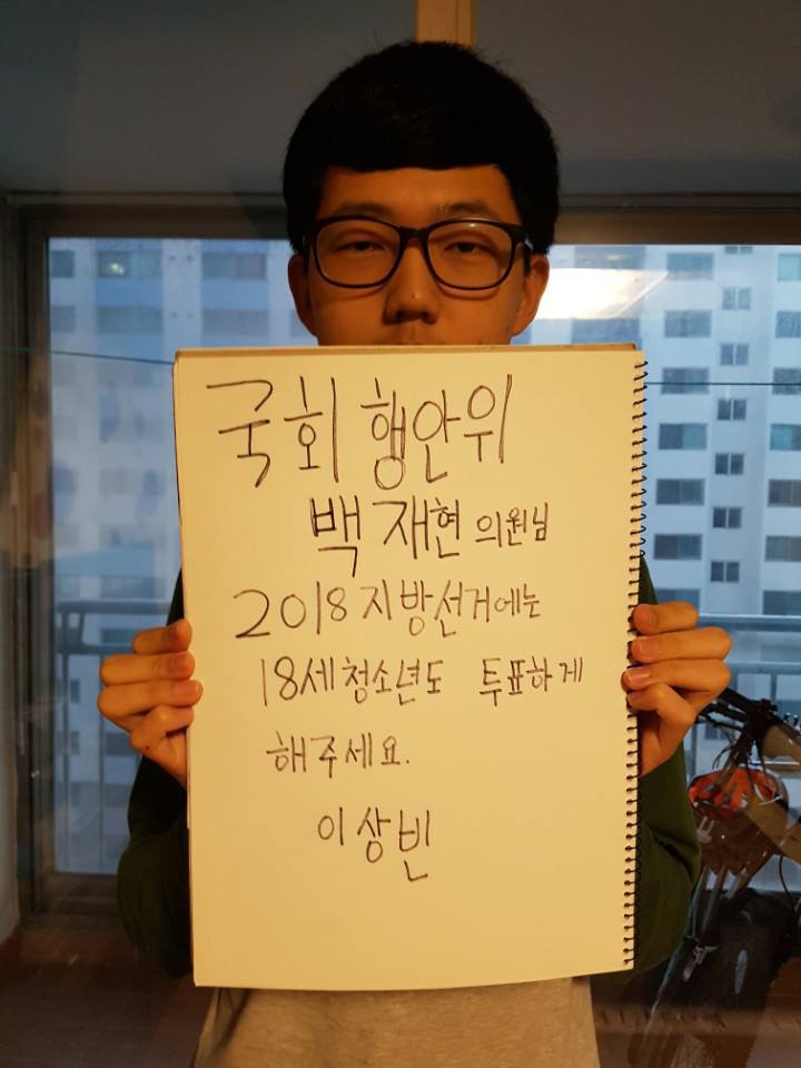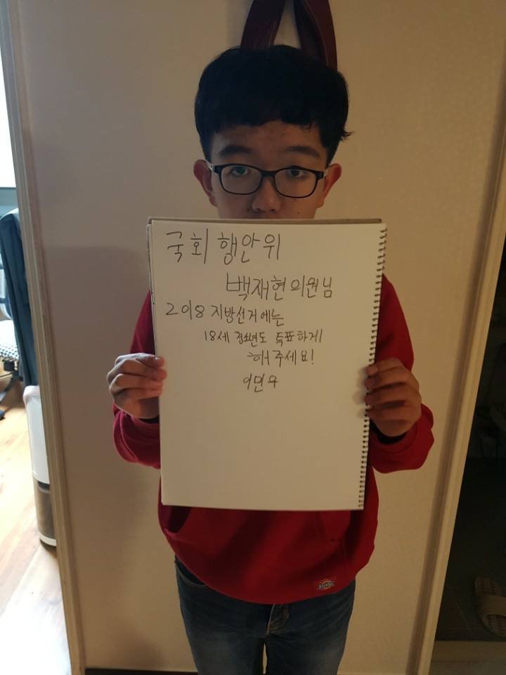 [수완뉴스=김동주기자] 지난 4일, 초등학생에서 부터 고등학생 까지 많은 수의 청소년들은 페이스북에서 “18세 청소년 선거권”을 이루기 위해 피켓 행사가 줄을 이었다. 이들은 18세 이상 선거권을 확립하기 위해 주도하고 있는 국회 행정안전위원회 소속 김영호 의원, 박남춘 의원, 백재현 의원, 소병훈 의원의 이름을 거론하며, 2018년도 지방선거에서 청소년들도 투표할 수 있도록 해달라고 요구하였다.