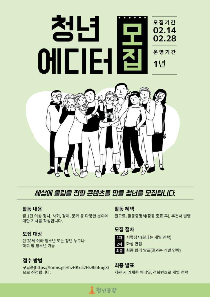 [수완뉴스=편집국] 수완뉴스 산하 매체인 청년공감이 2025년 청년 에디터를 모집한다. 청년공감은 이번 청년 에디터 모집에 대해, 청년들의 열정과 다양한 목소리를 담아낼 것이라며, 정치, 사회, 경제, 문화 등 다채로운 분야에서 세상에 울림을 전할 기회를 제공한다고 밝혔다.