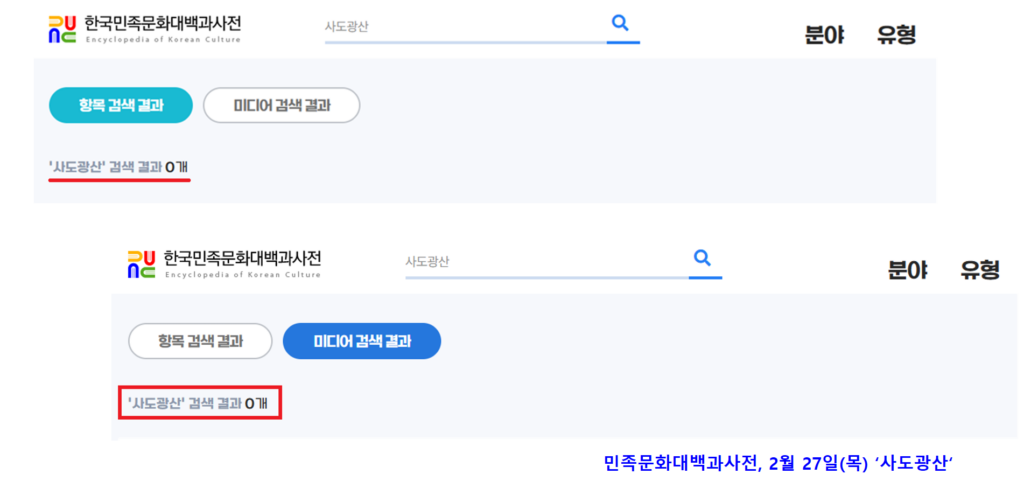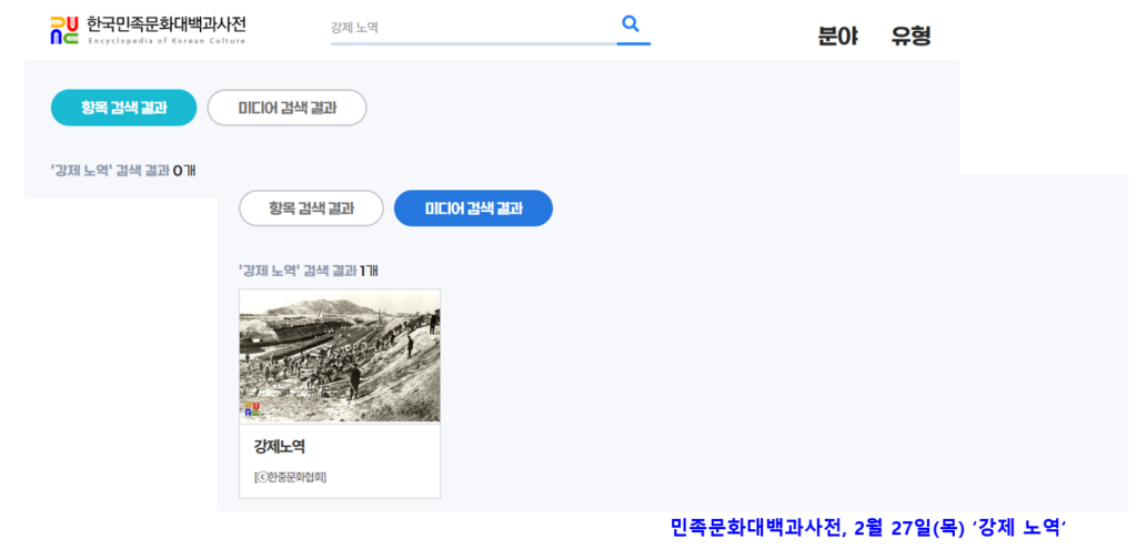 반면에 ‘조선인 강제연행’과 ‘강제동원’은 검색이 된다. 그러나 ‘강제 노역’은 항목 검색 결과 0개이고, 미디어 검색 결과 인천항에서의 사진도 1개뿐이다. ‘사도광산’은 항목 검색 결과와 미디어 검색 결과, 모두 0개로 나타났다.