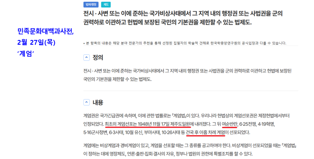 한편, 사전의 ‘계엄’ 부분에서는 틀린 지점들이 눈에 띄는데, 최초의 계엄선포는 1948년 11월 17일 제주도 일원에 내려졌다고 서술하고 있으나 국방부에 따르면 10월 25일 여수와 순천 지역에 내려졌다. “건국 이후 아홉 차례” 또한 실제 사실과 다르다. 국방부는 10차례라고 밝혔으며 지난해 12.3 내란 사태를 합하면 11차례다.
