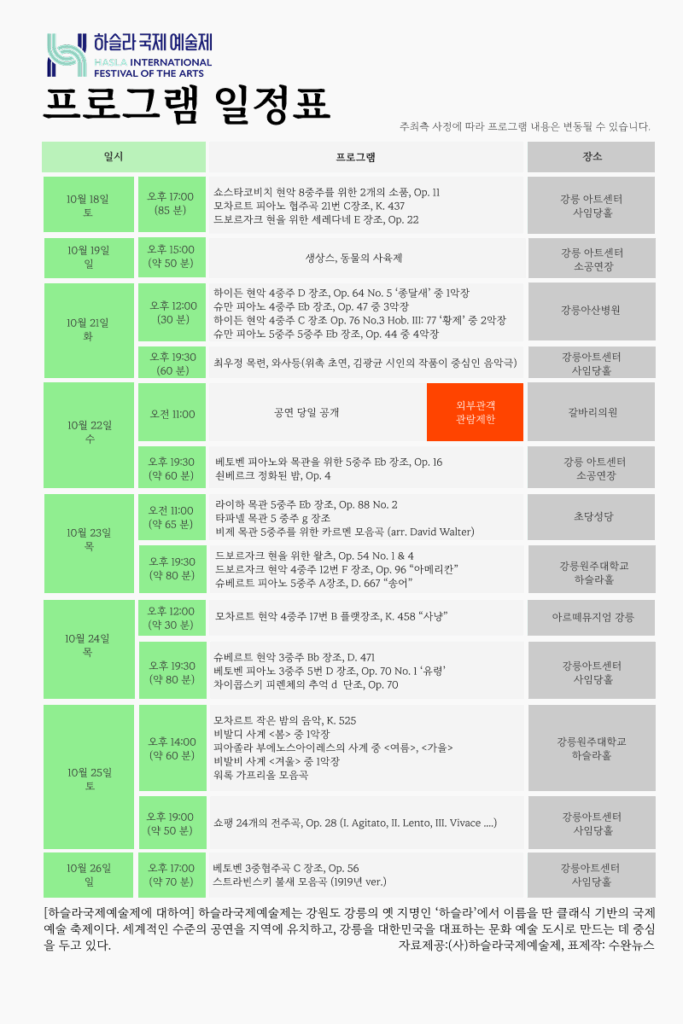 The 2nd Haslla International Arts Festival aims to be a festival where children, parents, and artists can communicate together, moving beyond simple performance viewing. In particular, the ‘Our Music Feast’ (우덜 음악잔치), organized with diverse programs throughout Gangneung, is expected to extend the festival experience for everyone by utilizing various spaces across the city—including the Gangneung Arts Center, Chodang Catholic Church, and Arte Museum Gangneung—as stages, breathing life into the local community and engaging with citizens.